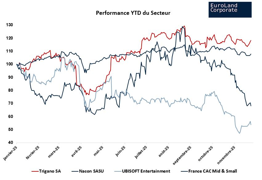 Trigano souffre (CA –6,8 %, marge 9,2 %) mais délivre un FCF solide et des perspectives 2026 en rebond. Nacon poursuit son redressement. Ubisoft réduit ses pertes et finalise le deal Tencent (1,16 Md€). Les curseurs repassent au vert.