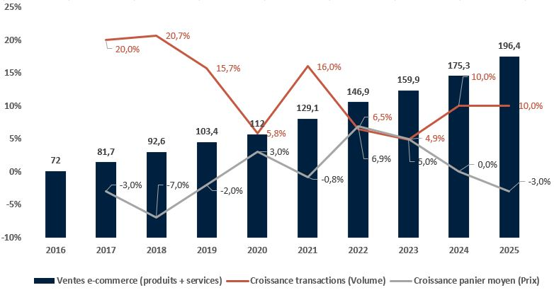 Le mix volume‑prix illustre clairement cette résilience. Le panier moyen recule de ‑3,0% à 62 €, sous l’effet de la désinflation, mais le volume de transactions continue d’augmenter à un rythme soutenu (+10,0%, soit 3,2 milliards d’achats en ligne), identique à celui observé en 2024. Cette dynamique tirée par les volumes montre que la demande reste bien orientée, même dans un contexte de pouvoir d’achat contraint.