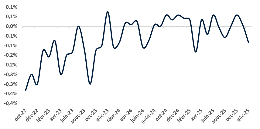 Ce contraste apparaît nettement lorsqu’on le met en perspective avec la consommation des ménages, qui se dégrade en 2025 et plus particulièrement en fin d’année : après un rebond de +1,6 % en novembre par rapport au mois d'octobre, les ventes du commerce de détail reculent de ‑0,6 % en décembre.