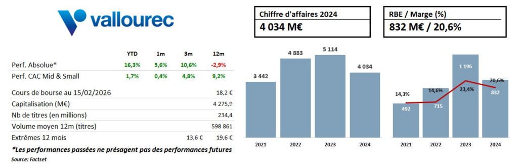 Vallourec se négocie à une valorisation attractive autour de 4,85× l’EV/EBITDA 2026, nettement inférieure à son principal concurrent Tenaris (4 fois plus gros en chiffres d’affaires), à ~7.48× sur la même base. Nous pensons que la société a un potentiel de rattrapage dans un contexte de reprise des capex des marchés de l’énergie. Le groupe devrait bénéficier d’une montée en puissance des livraisons à l’international ainsi que des effets « à plein » de la réorganisation de ses usines au Brésil.