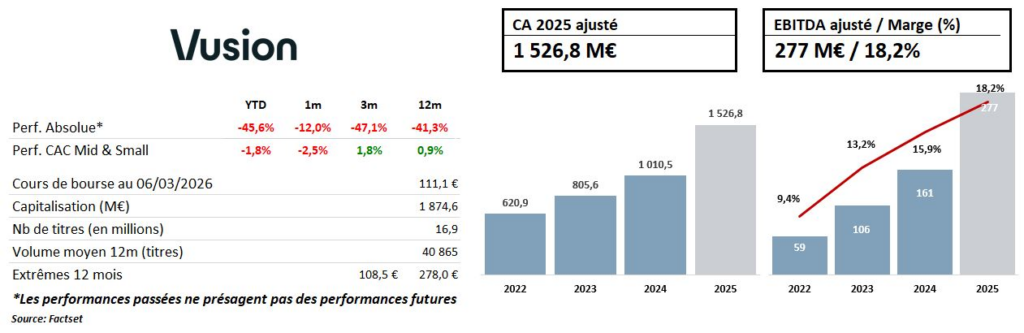 Il y a quelque chose d'assez saisissant dans la situation boursière de Vusion en ce début 2026. D'un côté, une entreprise qui affiche des résultats 2025 proprement remarquables : un chiffre d'affaires ajusté de 1 527 M€ en hausse de +51%, un EBITDA ajusté en progression de +73%, et un résultat net ajusté de 99 M€, en hausse de +85%. De l'autre, un titre qui, avant même la publication de ces chiffres, avait perdu plus de 40% sur trois mois — un décrochage en totale disconnexion avec la réalité opérationnelle du groupe.
