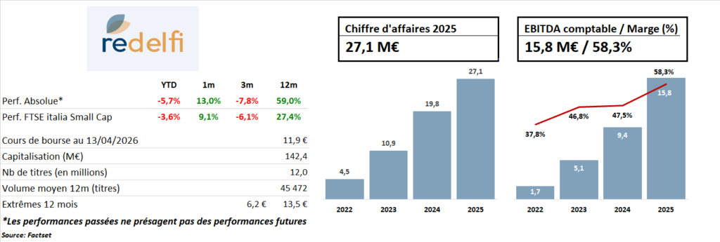 Au cours actuel (11,86 €/action), Redelfi capitalise 142,4 M€, soit un potentiel d'upside de +18% au regard de notre objectif de cours de 14 €/action. Le bilan, bien qu’en phase d'investissement, reste maîtrisé avec un levier dette nette/EBITDA de 1,9x, voué à se résorber rapidement dès 2027 avec la monétisation du pipeline.