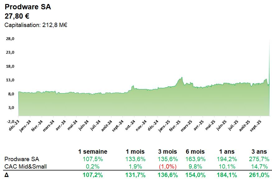 Prodware, spécialiste français de la transformation numérique des entreprises à travers les solutions Microsoft Dynamics et Sage, fait l’actualité cette semaine avec l’annonce d’une offre publique de retrait initiée par Phast Invest, son actionnaire majoritaire. Détenant désormais plus de 93 % du capital et 94 % des droits de vote, Phast Invest souhaite retirer Prodware de la cote via une offre à 28 € par action, suivie d’un retrait obligatoire. Ce prix représente une prime impressionnante de près de 148 % par rapport au dernier cours de clôture avant l’annonce (22 octobre 2025), et plus de +130 % sur les moyennes récentes à 20, 60 et 120 jours.