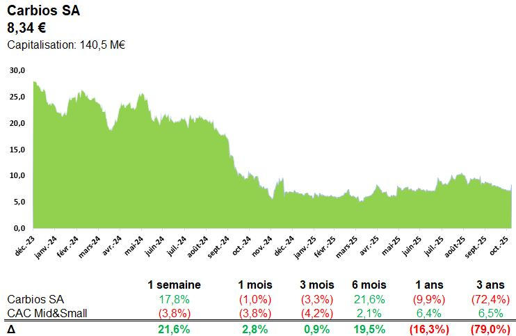 👉 Clariane : En juin, le groupe avait rassuré en bouclant avec six mois d’avance son programme de cessions, dont la vente de “Petit-fils”. Il avait ensuite retrouvé un accès normalisé au marché obligataire. Mais le 27 octobre, Clariane a revu à la baisse sa prévision de croissance d’Ebitda lors de son point d’activité trimestriel… et le titre a rechuté. Malgré tout, l’action reste +60 % depuis le début de l’année, mais affiche encore -80 % sur cinq ans : un dossier en redressement, mais qui part de très loin.