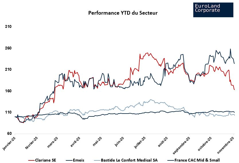 Clariane recule après avoir abaissé sa guidance, Emeis (ex-Orpea) résiste mais reste un dossier cabossé, Bastide le Confort Medical avance tranquillement sur le maintien à domicile.