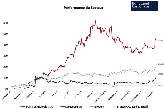 Exail Technologies s’impose comme l’un des dossiers français les plus emblématiques. Spécialiste de la robotique autonome navale (drones sous‑marins et de surface), le groupe tire 60 % de son activité de la défense. En 2025, la dynamique est exceptionnelle : plus de 600 M€ de revenus au S1 (+35 %) et des prises de commandes en hausse de +279 %. Le titre a connu un rally impressionnant (+370%), porté par les programmes européens de guerre des mines et la montée en puissance de la robotisation navale.