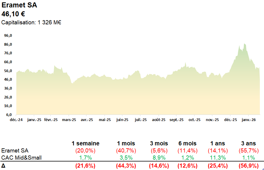 Eramet décroche de plus de 20% à Paris, à 46,10 €, après l’annonce d’une perte nette de 477 M€ en 2025. Un exercice plombé par la baisse des prix des matières premières et des vents contraires opérationnels.