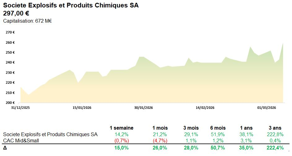 Voilà ce que font les valeurs discrètes qui font un travail remarquable : elles n'ont pas besoin de faire de bruit. EPC capitalise à présent plus de 670 M€. En cinq ans, le titre a été multiplié par près de trois, passant de la zone des 100 € aux 297 € actuels, dans l'indifférence quasi générale. Et c'est bien parti pour durer.