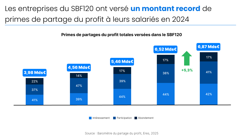 Le baromètre 2025 publié par Eres le confirme : en 2024, les entreprises du SBF120 ont redistribué 6,87 milliards d’euros à leurs salariés sous forme de participation, intéressement et abondement. À cela s’ajoutent près d’un milliard de dividendes versés aux actionnaires salariés, portant l’enveloppe moyenne totale à près de 7 000 euros par collaborateur. Loin de l’image d’un capitalisme indifférent, le SBF120 illustre au contraire une dynamique de redistribution silencieuse, mais réelle.