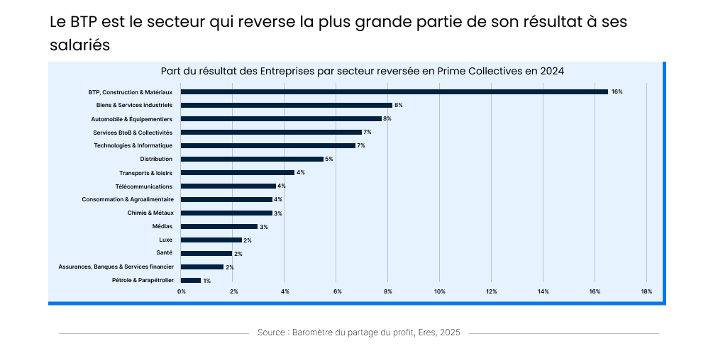 Les résultats du baromètre en témoignent : en montant absolu, le luxe domine avec plus de 9 500 euros de primes collectives par salarié. Mais en proportion, c’est le BTP qui se distingue : 16 % de son résultat redistribué à ses équipes, contre seulement 2 % dans le luxe.