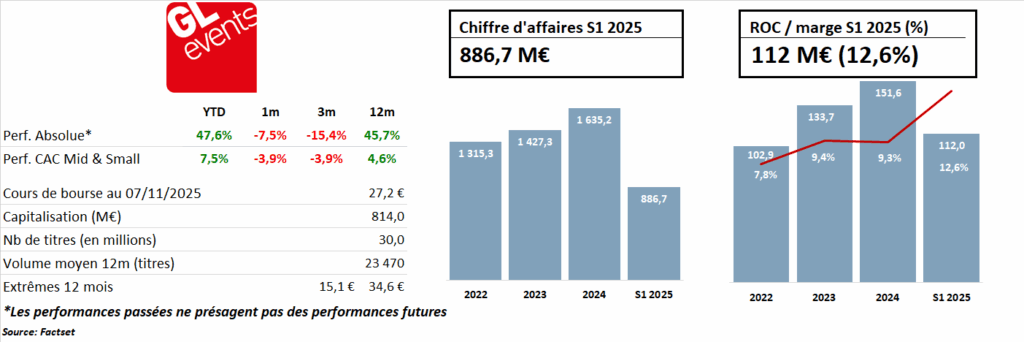 GL Events est également très actif dans le domaine de la croissance externe, avec la reprise des activités d’un parc de 25 salles de spectacles en France auprès de Fimalac, et GL Live est en discussion exclusive avec le groupe saoudien ADD, qui y réalise 100 millions de chiffre d’affaires.