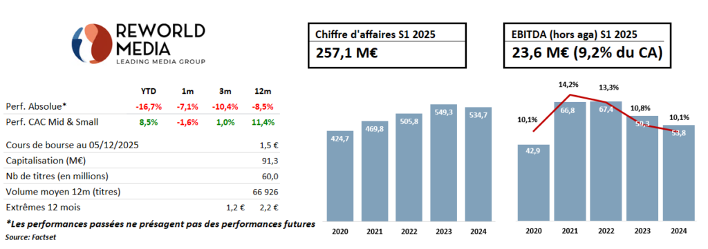 Reworld Media bénéficie également d’une puissance de diffusion remarquable pour une small cap : environ 33,1 millions de visiteurs uniques chaque mois sur le digital et 83,5 millions d’abonnés sur les réseaux sociaux. Des chiffres qui confirment son statut de groupe média majeur sur le web et les plateformes sociales en France.