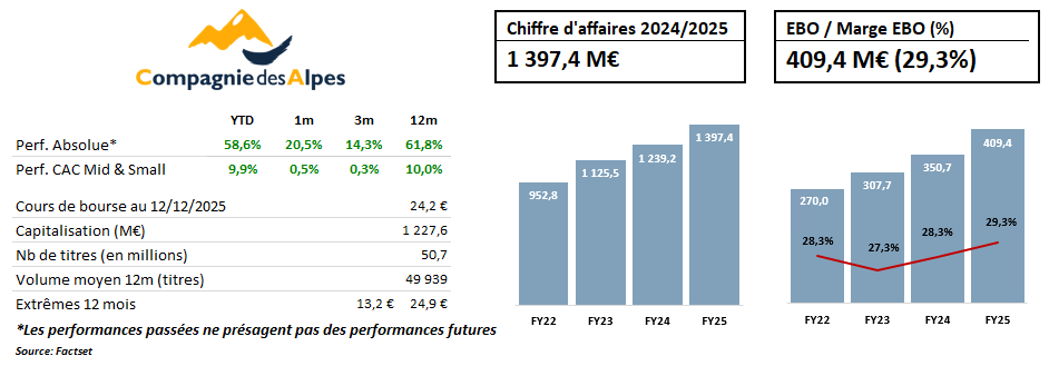 En matière de chiffres, CDA a encore franchi un cap significatif au terme de son exercice 2024/2025 (clôture au 30/09) en affichant des résultats records. Le chiffre d’affaires consolidé du groupe a atteint 1 397 M€, en croissance annuelle de +12,8 % et de +8,9 % à périmètre comparable, pour un EBO (Excédent Brut Opérationnel) de 409 M€ (+17%), soit une marge de près de 30%. La génération de cash a également été très solide (+55% par rapport à 2023/2024), ce qui a permis au groupe à la fois d’afficher un ratio de levier hors IFRS sous contrôle à 2,3x, mais surtout d’annoncer un dividende record, en hausse de +10%. Au cours actuel, le rendement du titre (4,5%) est particulièrement attractif.