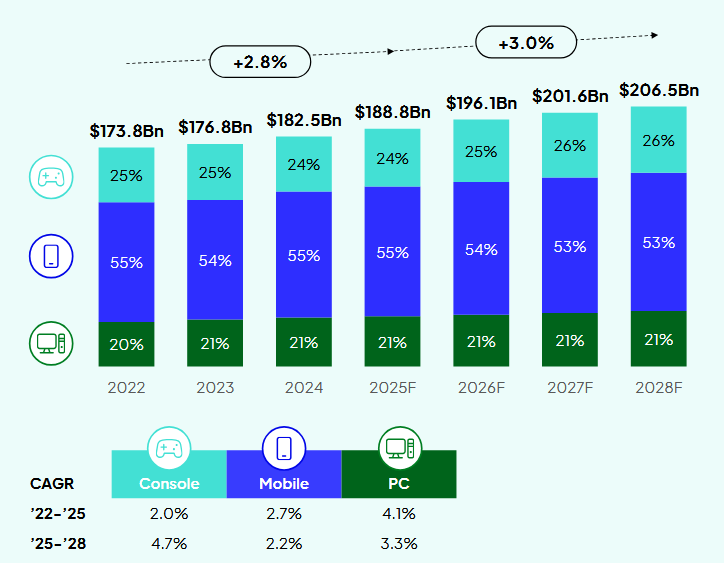 Selon le Global Games Market Report 2025 de Newzoo, le marché mondial du jeu vidéo devrait générer 188,8 Md$ de chiffre d’affaires en 2025, soit une croissance annuelle de +3,4%. Cette progression reste positive, mais elle marque un net ralentissement par rapport aux rythmes à deux chiffres observés avant 2022, confirmant l’entrée du secteur dans une phase de maturité.